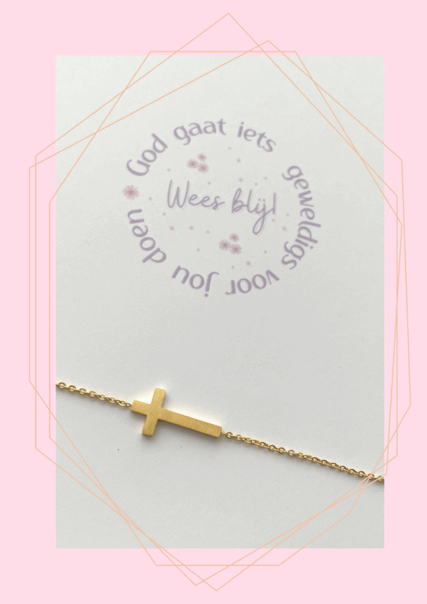 RVS armbandje in goudkleur met kruisje. Het kruisje is 2cm lang. De lengte van het armbandje is 18cm en verstelbaar tot 22cm. Inclusief kaartje met tekst!