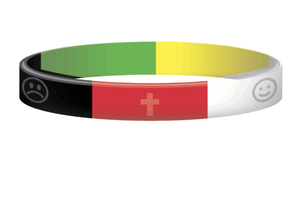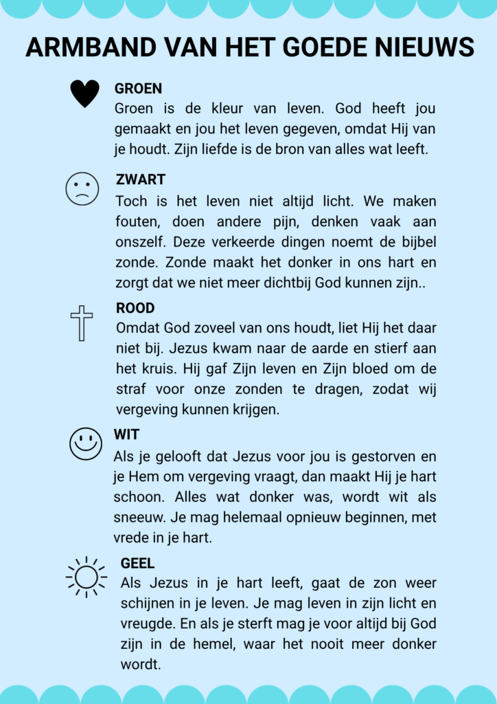 Siliconen armbandje met vijf kleuren en symbolen om het evangelie uit te leggen.
