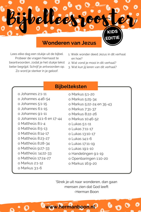 KIDS EDITIE! Bijbelleesrooster om een een maand lang de bijbel te lezen aan de hand van een bepaald onderwerp. Dit keer met het thema Wonderen van Jezus. Voed jezelf met het woord van God, het is vol kracht en leven. Verkrijgbaar met verschillende onderwerpen.