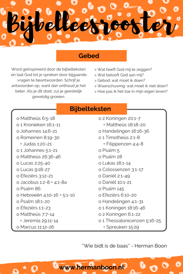 Bijbelleesrooster om een een maand lang de bijbel te lezen aan de hand van een bepaald onderwerp. Dit keer met het thema gebed. Voed jezelf met het woord van God, het is vol kracht en leven. Verkrijgbaar met verschillende onderwerpen.