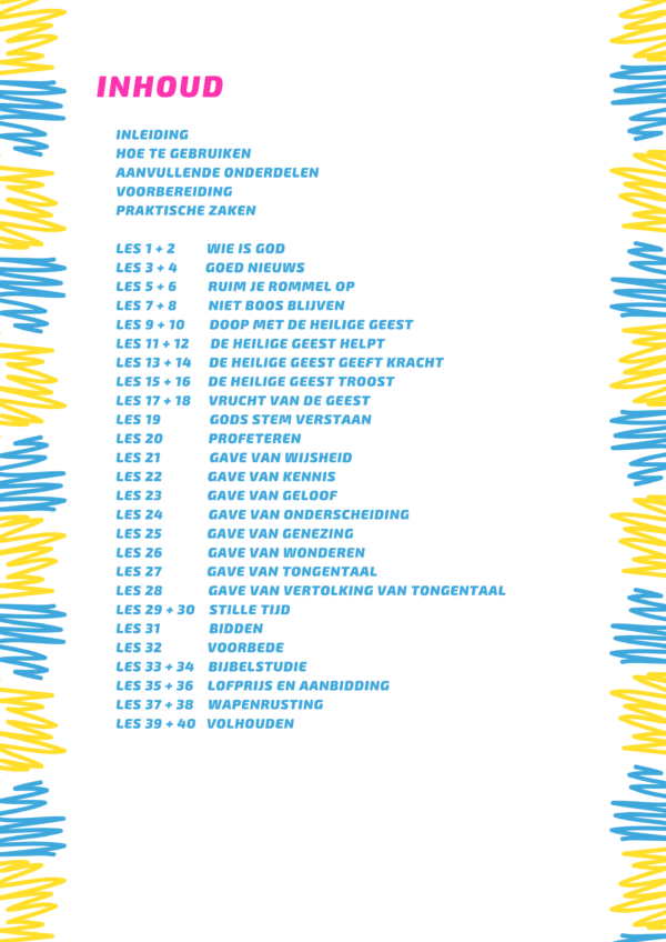 In 40 praktische lessen leren kinderen, in de leeftijd van 6 tot 12 jaar, hoe leuk, mooi en avontuurlijk het is om te leven met God en de Heilige Geest. De lessen bestaan uit allerlei interactieve onderdelen naar aanleiding van een Dikke vriendenshow waarin het onderwijs wordt uitgelegd op een grappige en duidelijke manier. De kinderen leren te kiezen voor een vriendschap met Jezus, ontvangen de Heilige Geest, leren te wandelen in de gaven van de Geest en ontdekken hoe fijn het is om elke dag tijd met God te hebben. De lessen zullen het geloof van de kinderen opbouwen en een fundament geven voor de rest van hun leven.