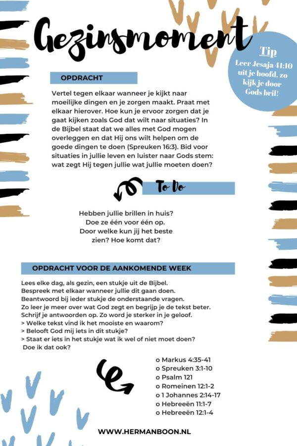 Een gezinsmoment is een vast moment in de week om God en elkaar als gezin beter te leren kennen. In Psalm 78:3-4 staat dat ouders hun kinderen vertellen over de kracht van God, zodat ze gaan leven naar Zijn principes. Het is zo belangrijk om hier als ouder(s) regelmatig en bewust tijd voor te nemen. Deze kaart helpt je om zo’n moment in te vullen. Het thema van deze kaart is ‘Door welke bril kijk jij? ‘.