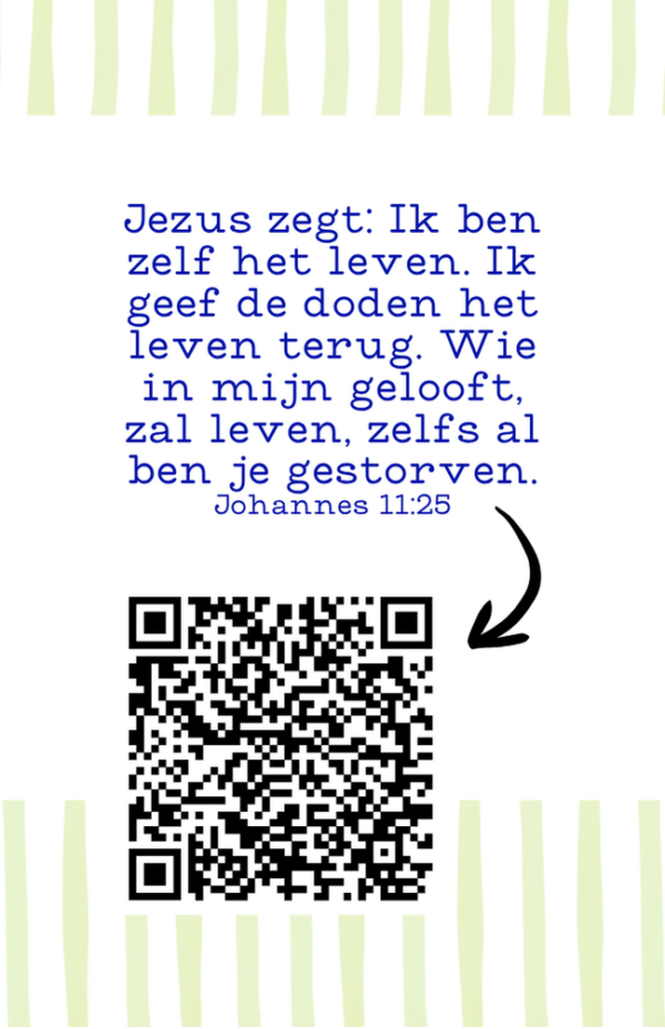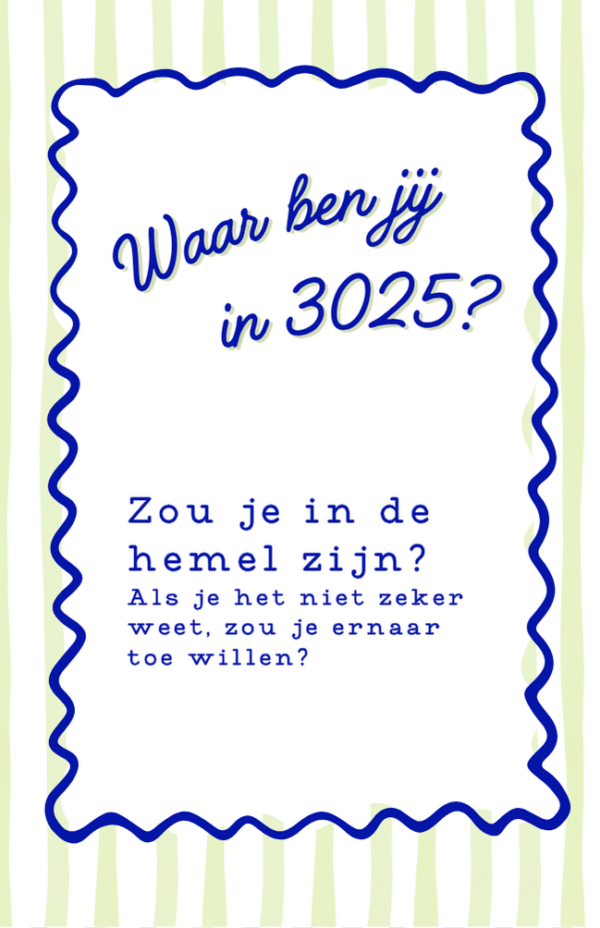Mini kaartje met de tekst ‘Waar ben je in 3026?’. Op de achterkant staat de bijbeltekst Johannes 11:25 Jezus zegt: Ik ben zelf het leven. Ik geef de doden het leven terug. Wie in mijn gelooft, zal leven, zelfs al ben je gestorven. Daarnaast staat er een QR code op die opent bij scannen het liedje ‘veilig voor de eeuwigheid’ van Herman Boon. Deze kaartjes worden verkocht in een pakketje van 10 stuks.