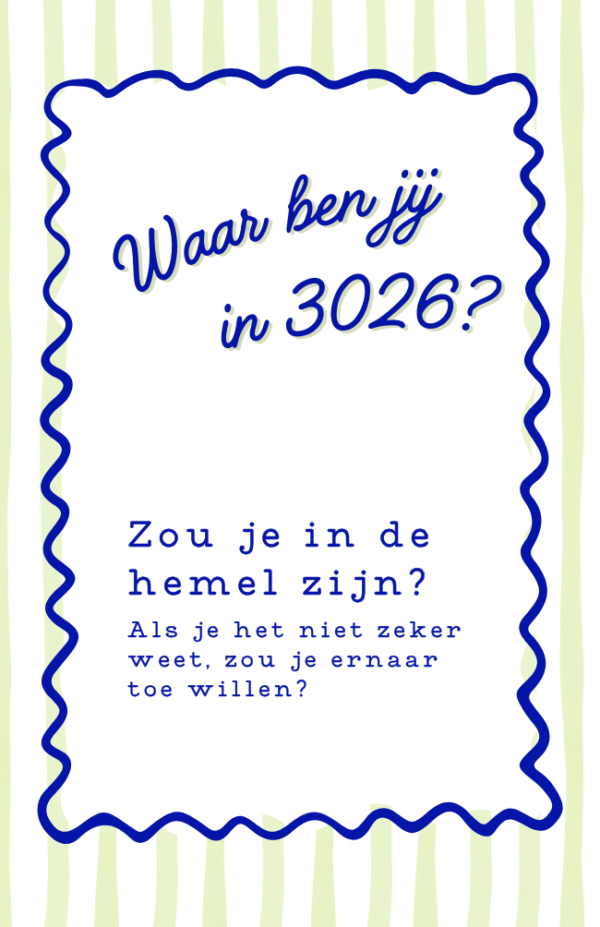 Mini kaartje met de tekst ‘Waar ben je in 3026?’. Op de achterkant staat de bijbeltekst Johannes 11:25 Jezus zegt: Ik ben zelf het leven. Ik geef de doden het leven terug. Wie in mijn gelooft, zal leven, zelfs al ben je gestorven. Daarnaast staat er een QR code op die opent bij scannen het liedje ‘veilig voor de eeuwigheid’ van Herman Boon. Deze kaartjes worden verkocht in een pakketje van 10 stuks.