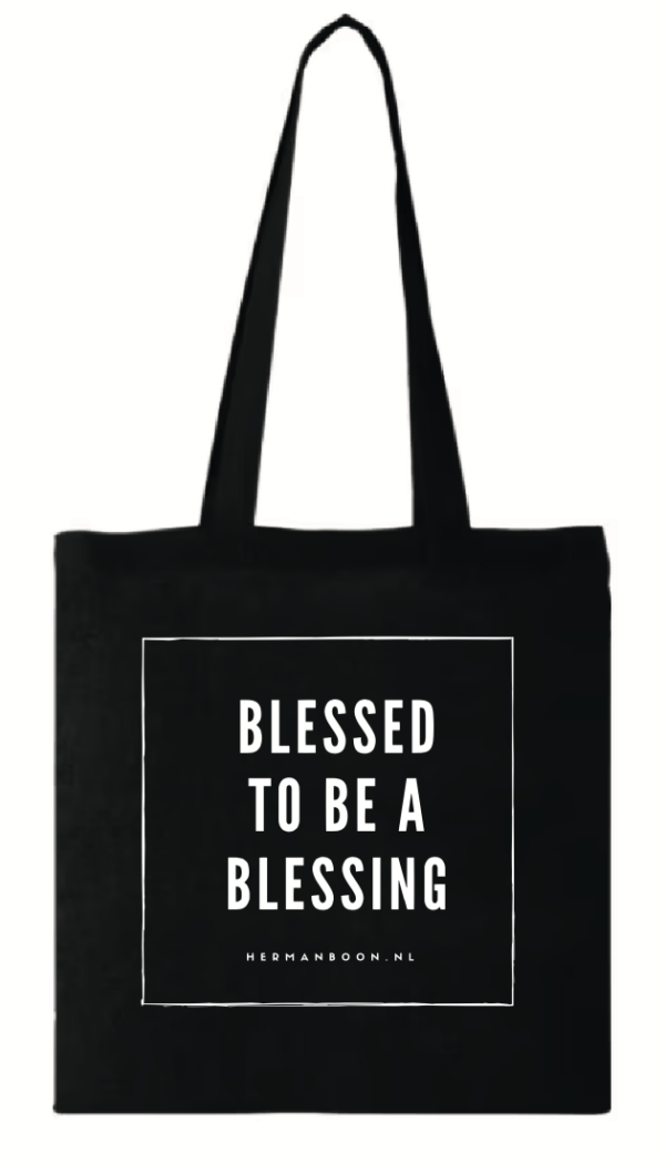 Katoenen tasje met hengels in het zwart. Aan 1 zijde staat de tekst ‘Blessed to be a blessing’ daar onder staat in het klein www.dekatapult.nl.